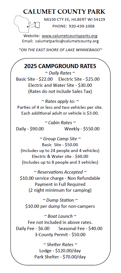 Calumet County Parks Department will start taking reservations for camping twelve (12) months, 365 days, in advance to the date of the first night of the reservation. EXCEPTION: Dates will be established for the first acceptance date for Memorial Day Weekend, Father’s Day Weekend, 4th of July, and Labor Day Weekend.
